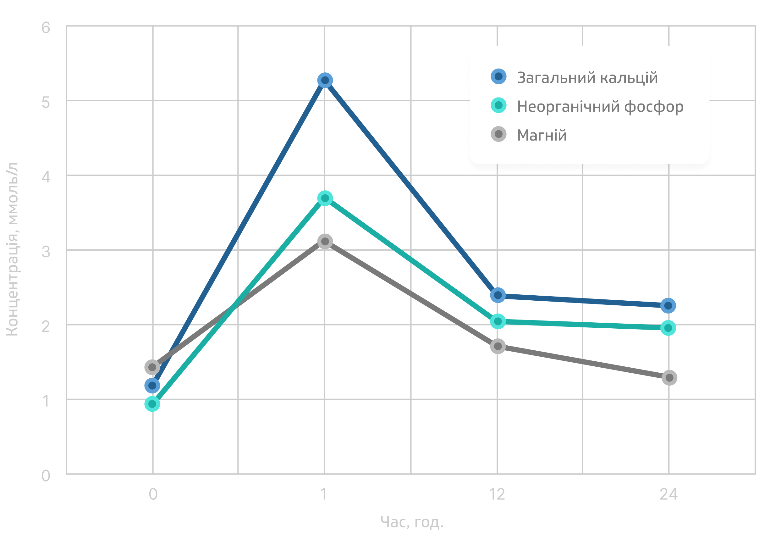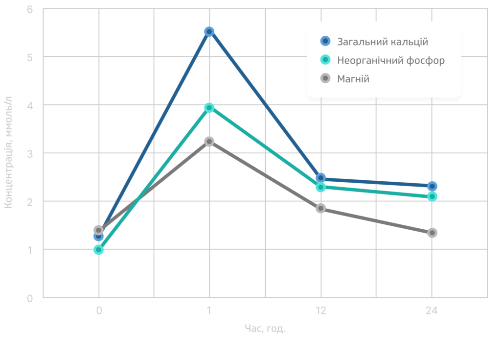 Вміст кальцію в сироватці крові збільшився у 4,2 рази, фосфору — у 3,9 рази, магнію — у 2,16 рази. Спостерігалось поліпшення загального стану тварин. Згодом одужання тварин.